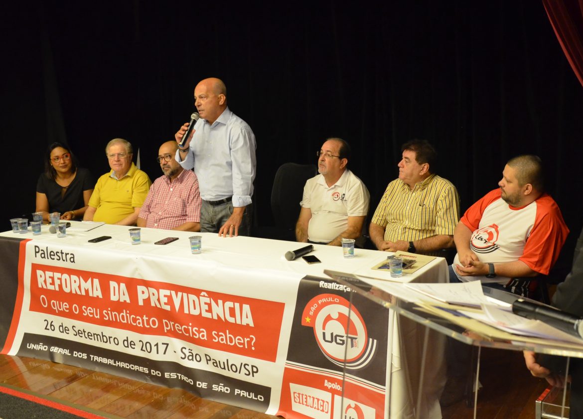 Aconteceu ontem (26), no auditório do Siemaco São Paulo, um encontro com sindicatos filiados à UGT-SP para debater a Reforma Previdenciária que tramita no Congresso. O vice-presidente da UGT nacional e presidente da FEMACO e FENASCON, Roberto Santiago participou do evento e coordenou os trabalhos ao lado de Moacyr Pereira e André Filho, presidente e tesoureiro do Siemaco São Paulo.