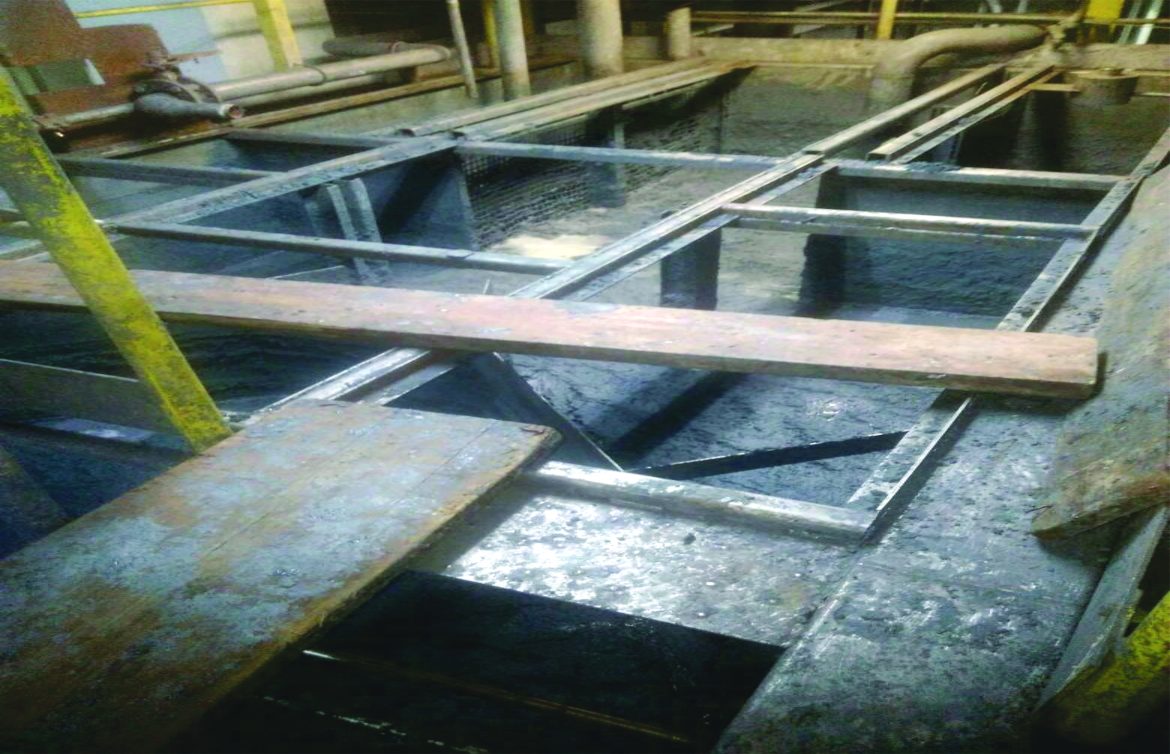 De modo irresponsável, colocaram tábuas de madeira sobre o tanque de coagulação para o trânsito dos trabalhadores, sem oferecer qualquer segurança aos companheiros.