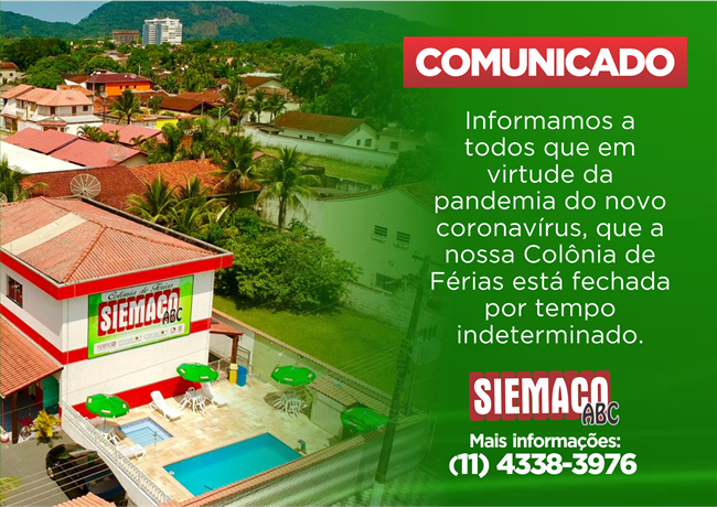 Informamos a todos que em virtude da pandemia do novo Coronavírus (Covid-19), que a nossa Colônia de Férias Siemaco ABC, está fechada por tempo indeterminado.