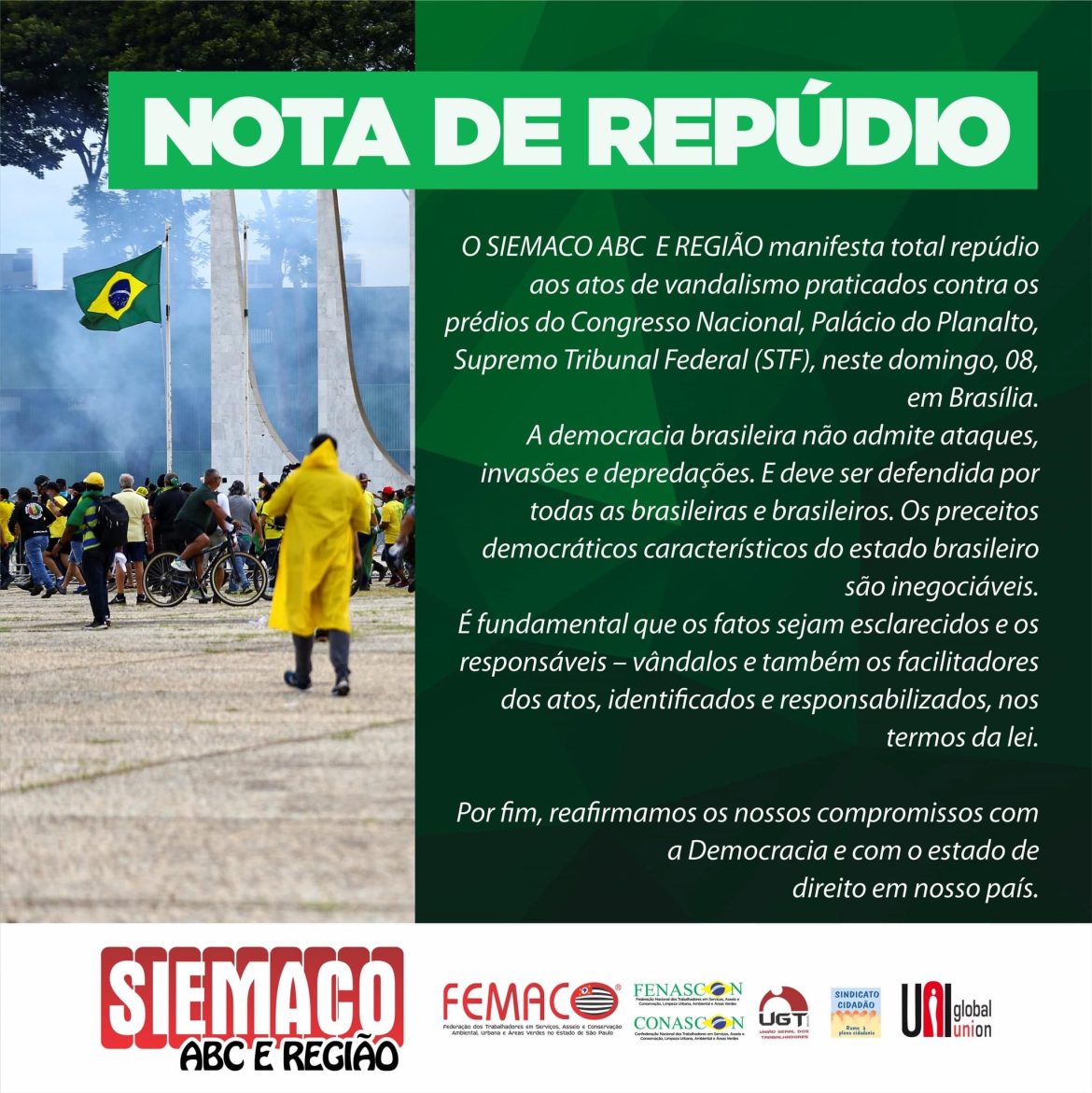 O SIEMACO ABC E REGIÃO manifesta total repúdio aos atos de vandalismo praticados contra os prédios do Congresso Nacional, Palácio do Planalto, Supremo Tribunal Federal (STF), neste domingo, 08, em Brasília.